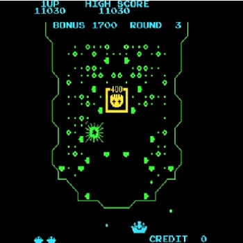 『ナバロン』は縦長のモニターを使用し、プレイヤーは画面の下端や左右端を移動しながら砲撃を行います。入力はシンプルで、レバーによる左右移動と、1つのショットボタンという構成です。画面上には「半島」を模した要塞のような地形が存在し、その上に点状の障害物や円形の機雷が散りばめられています。プレイヤーの目的は、それらを撃ち抜き、盤面をすべて片付けることでラウンドをクリアすることにありました。